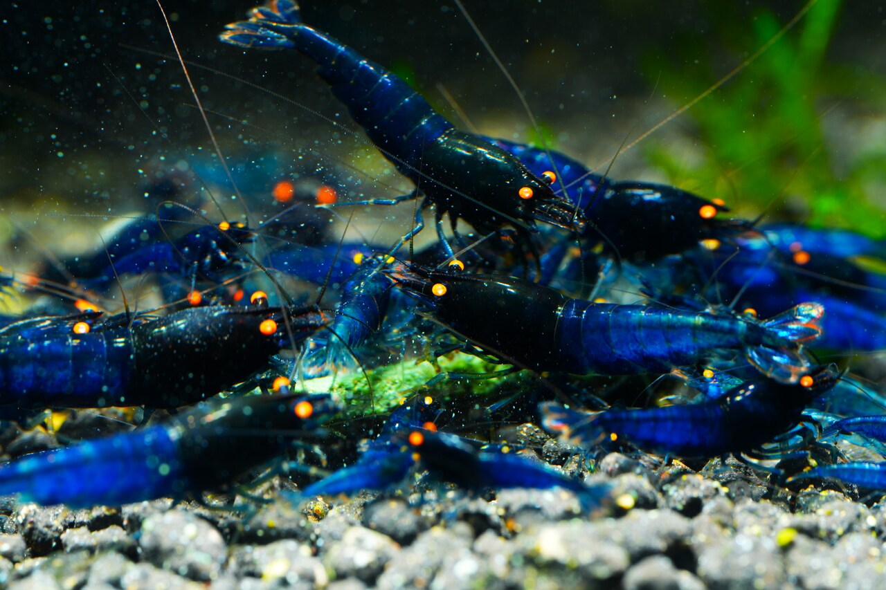 Krewetki Blue Devil Orange Eye to jedna z najbardziej efektownych odmian Caridina dostępnych w akwarystyce. Ich pancerz zachwyca głębokim, nasyconym odcieniem niebieskiego, który w połączeniu z wyrazistymi, pomarańczowymi oczami tworzy niesamowity kontrast. Ta unikalna kolorystyka sprawia, że krewetki te są prawdziwą ozdobą każdego akwarium.